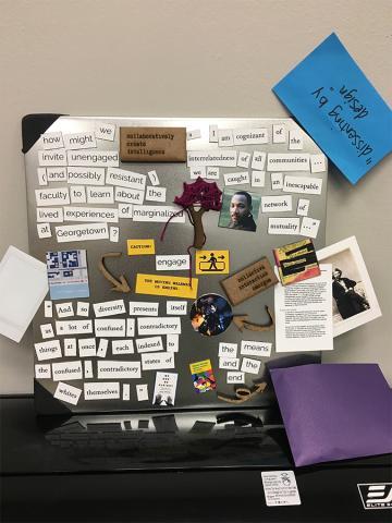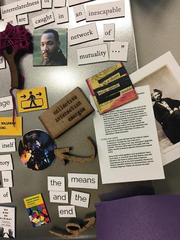 A Portfolio In(ter)action is a physical addendum or counterpart to my cumulative ePortfolio that I have created as part of my graduate program. Consisting of magnetic poetry, quotes, artwork, and poems, each piece of set of items corresponds to a project I completed during my MA degree at Georgetown.