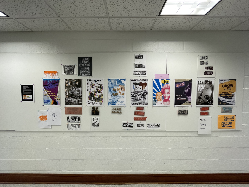 Students created an 11x17" music event poster based on a song of their choice and inspired by the Postmodern punk DIY design methods featured in our Spagnuolo Gallery, One Nation Underground: Punk Visual Culture 1976-1985. The Walsh building was the former heart of punk music culture in DC and students listened to a playlist of punk music once played in the same building as their classroom. As part of the history of postmodernism, students had to incorporate 1 or 2 manual / DIY approaches to the imagery into their poster: linocut, embossed label maker, photocopy, ripped or torn edges, typewriter text, etc. and in the spirit of postmodern hybridity — blend with Maker Hub technology. These textures or elements were scanned or photographed and integrated within their poster using Adobe Software. Here is a Spotify class playlist based on the student-chosen songs/musicians of their posters.
