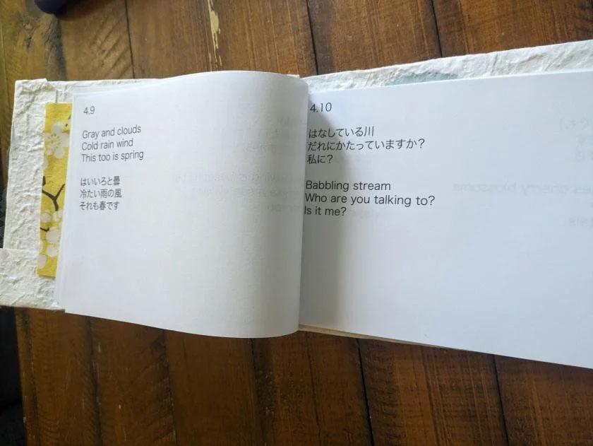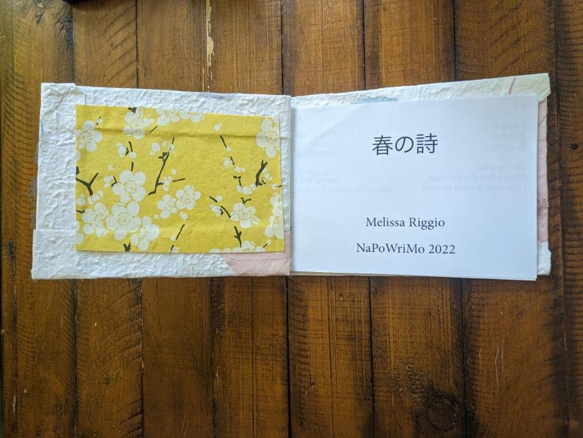 Every April I participate in National Poetry Writing Month, where I write a poem a day. To exercise my Japanese skills, I write poems (3 lines but not according to haiku syllable rules) reflecting the season of spring. I chose to bind my 2022 poems during the bookbinding workshop offered by the Maker Hub and Creating Writing Minor. I love seeing my work in print, and the paper offered by the Maker Hub had delightfully springlike themes to represent my words.